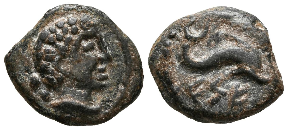 CESE (Tarragona). Sextante. (Ae. 2,96g/17mm). 120-20 a.C. (FAB-2343). Anv: Cabeza masculina a derecha, detrás dos puntos. Rev: Delfín a derecha, debajo leyenda ibérica: CeSE. MBC+. Bonito ejemplar.