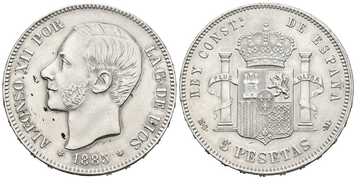 ALFONSO XII (1874-1885). 5 Pesetas. (Ar. 24,86g/37mm). 1885 *18-87. Madrid MSM. (Cal-2019-62). Acuñación póstuma. EBC. Limpiada.