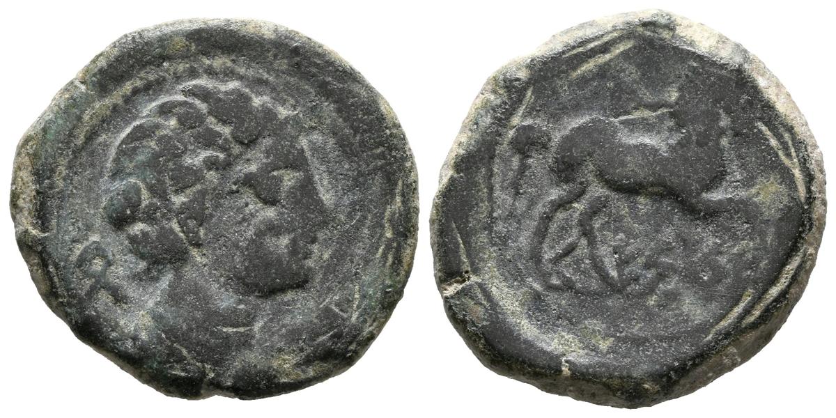 CESE (Tarragona). Semis. (Ae. 6,27g/22mm). 110-20 a.C. (FAB-2353). Anv: Cabeza masculina a derecha, detrás letra ibérica Be. Rev: Caballo a derecha, debajo leyenda ibérica: CESSE. MBC-.