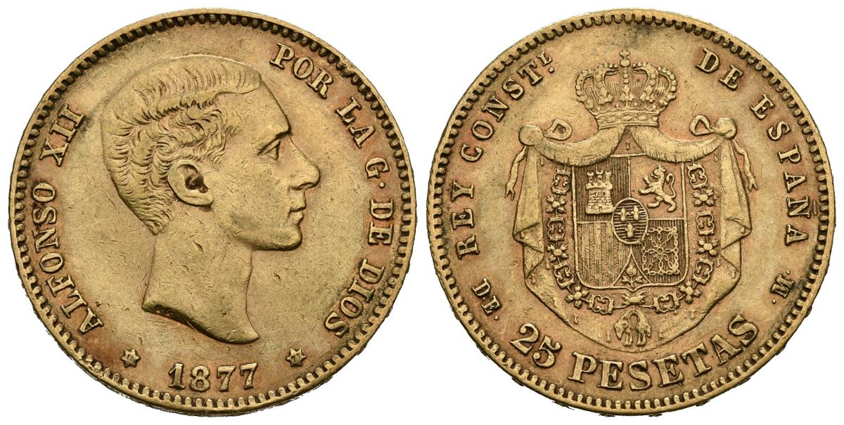 ALFONSO XII (1874-1885). 25 Pesetas. (Au. 8,06g/24mm). 1877 *18-77. Madrid DEM. (Cal-2019-68). MBC+. Marquitas.