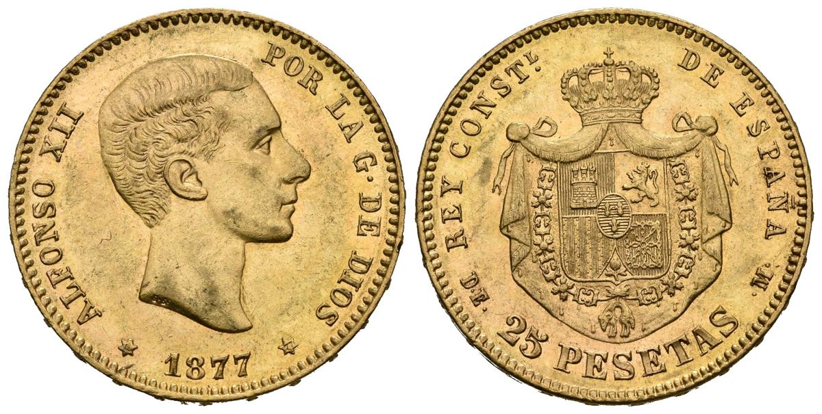 ALFONSO XII (1874-1885). 25 Pesetas. (Au. 8,06g/24mm). 1877 *18-77. Madrid DEM. (Cal-2019-68). MBC+.