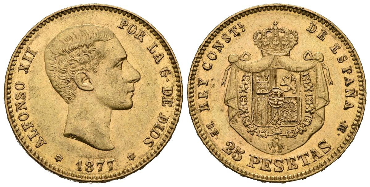 ALFONSO XII (1874-1885). 25 Pesetas. (Au. 8,05g/24mm). 1877 *18-77. Madrid DEM. (Cal-2019-68). MBC+. Marquitas.