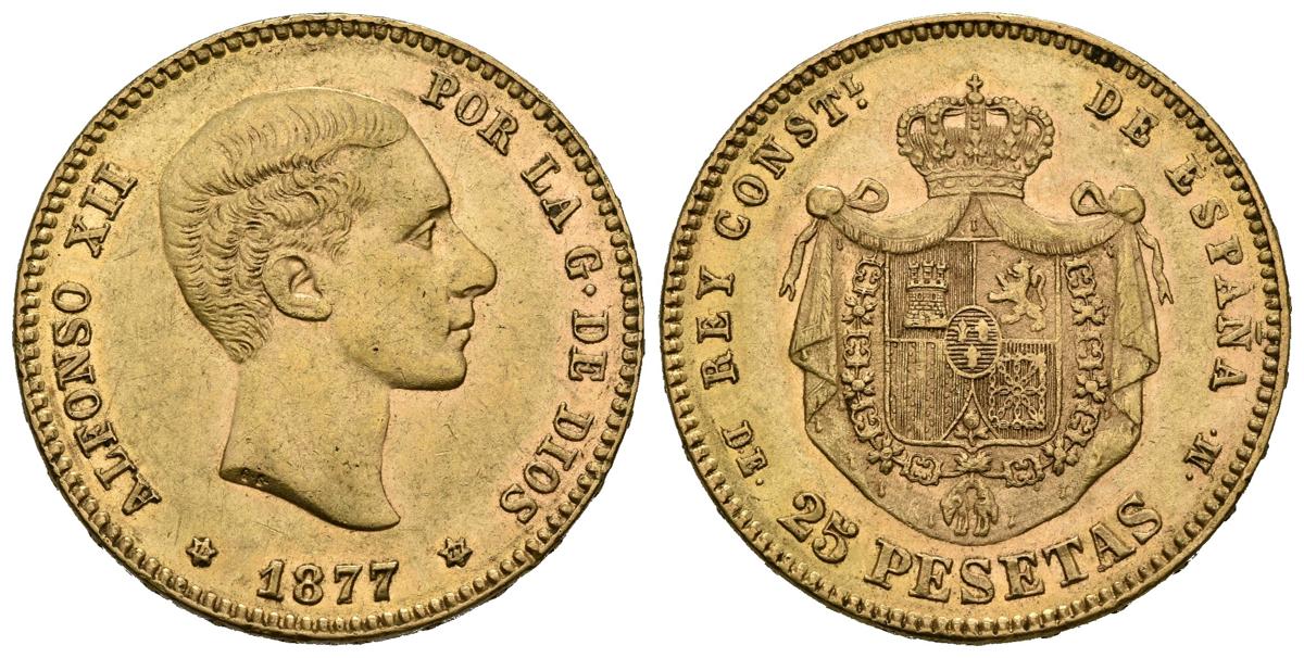 ALFONSO XII (1874-1885). 25 Pesetas. (Au. 8,05g/24mm). 1877 *18-77. Madrid DEM. (Cal-2019-68). MBC+.