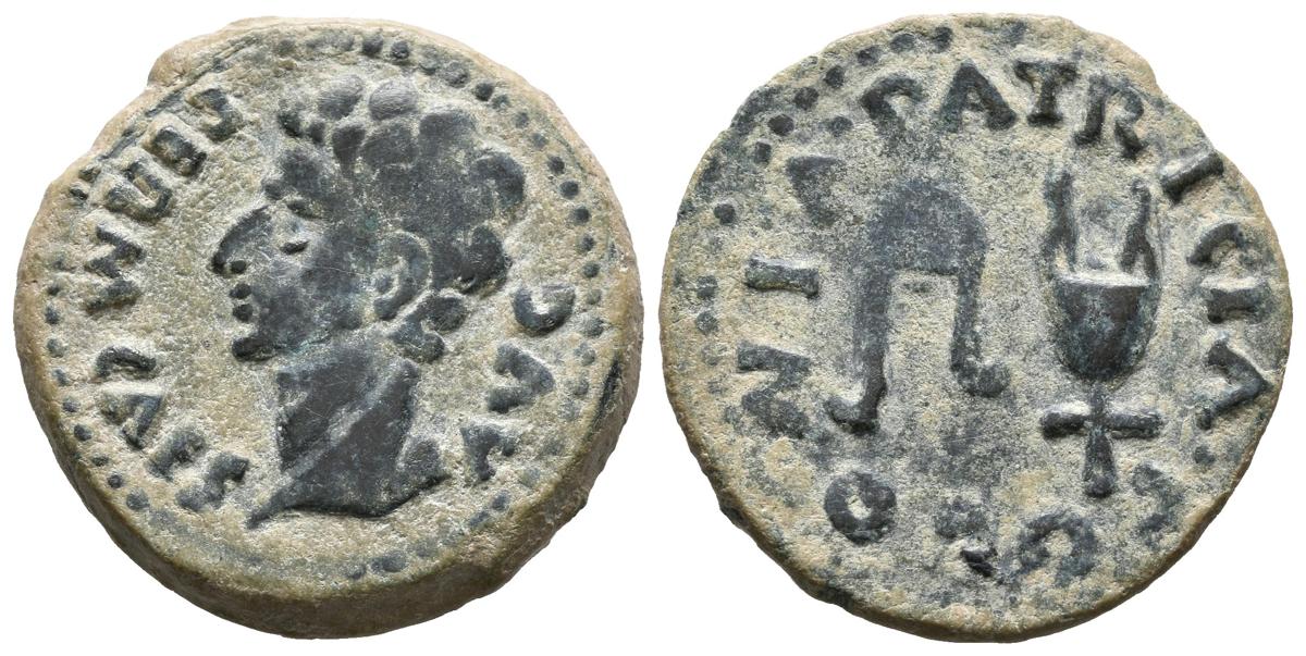 COLONIA PATRICIA (Córdoba). Semis. (Ae. 5,64g/23mm). 27 a.C.-14 d.C. (FAB-1992). Anv: Cabeza masculina a izquierda, alrededor leyenda: PERM CAES AVG. Rev: Gorro flamíneo y símpulo, alrededor leyenda: COLONIA PATRICIA. MBC.