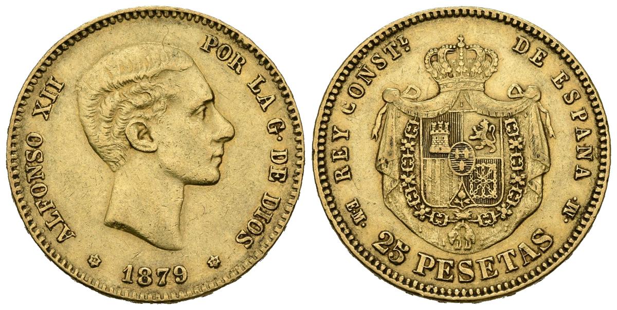 ALFONSO XII (1874-1885). 25 Pesetas. (Au. 8,01g/24mm). 1879 *18-79. Madrid EMM. (Cal-2019-73). MBC+. Marquitas.