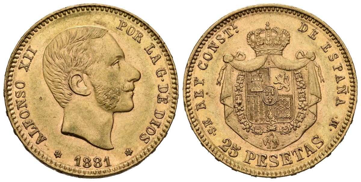 ALFONSO XII (1874-1885). 25 Pesetas. (Au. 8,05g/24mm). 1881 *18-81. Madrid MSM. (Cal-2019-82). EBC-. Marquitas.