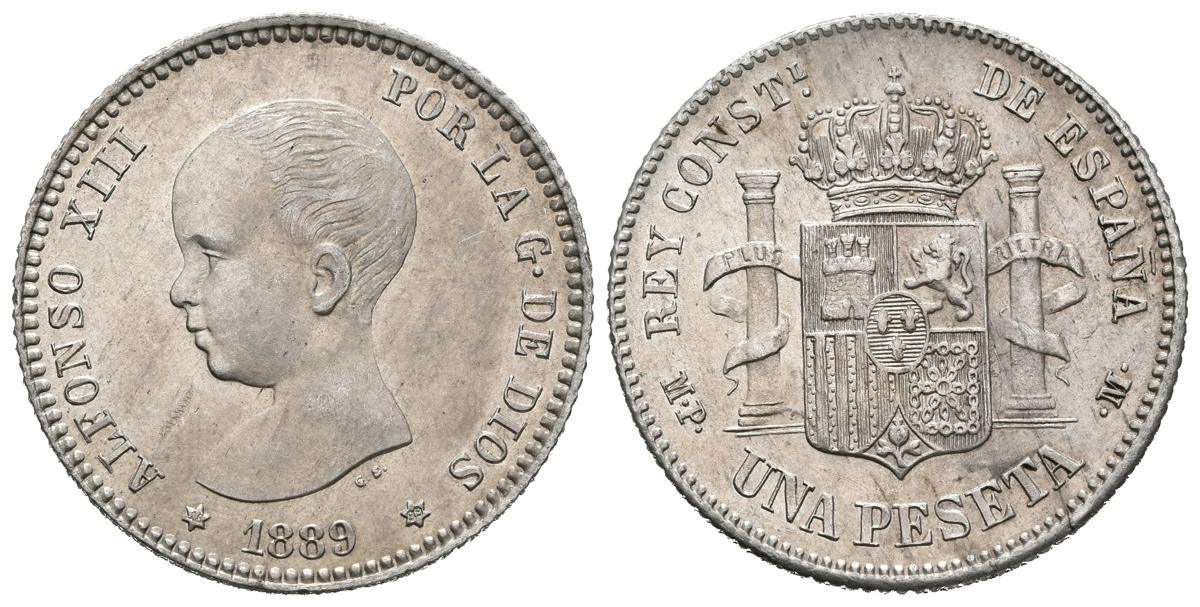 ALFONSO XIII (1885-1931). 1 Peseta. (Ar. 4,99g/23mm). 1889 *18-89. Madrid MPM. (Cal-2019-52). EBC+. Restos de brillo original. Precioso ejemplar raro así.