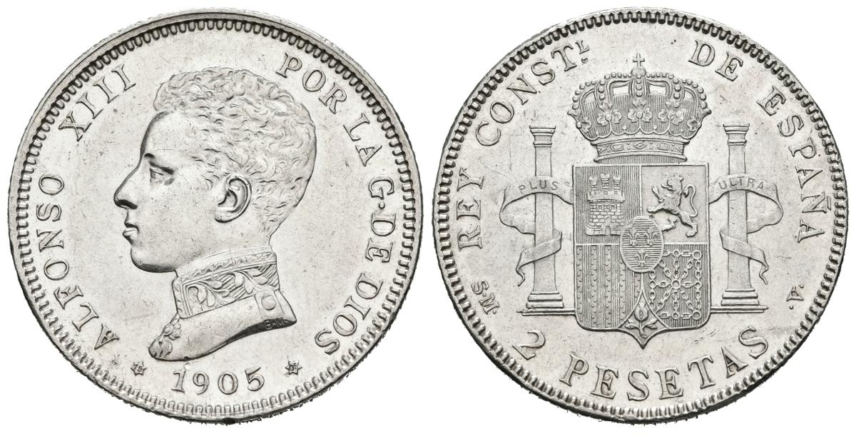 ALFONSO XIII (1885-1931). 2 Pesetas. (Ar. 10,01g /27mm). 1905 *19-05. Madrid SMV. (Cal-2019-88). SC-. Rayitas de limpieza.