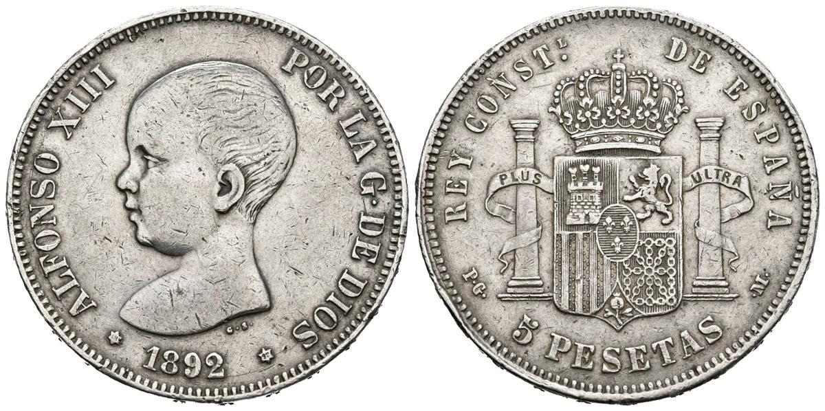 ALFONSO XIII (1885-1931). 5 Pesetas (Ar. 24,84g/38mm). 1892 *18-92. Madrid PGM. (Cal-2019-93). MBC+. Bonito tono.