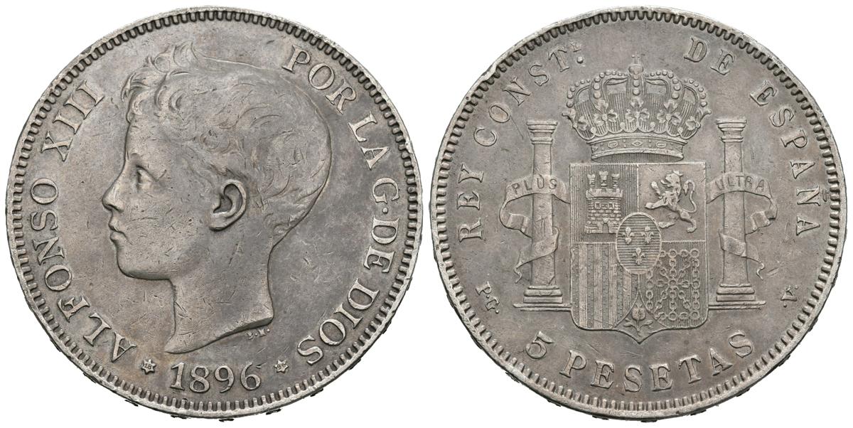 ALFONSO XIII (1885-1931). 5 Pesetas. (Ar. 24,76g /37mm). 1896 *18-96. Madrid PGV. (Cal-2019-106). MBC+. Bonito tono. Golpecito en el canto.