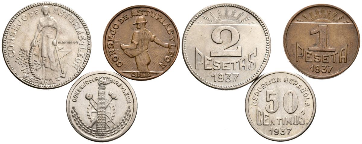 CONSEJO DE ASTURIAS y LEON. Conjunto de tres valores acuñados por este Consejo: 50 Céntimos, 1 y 2 Pesetas. 1937. (Cal-2019-8/10). EBC+.