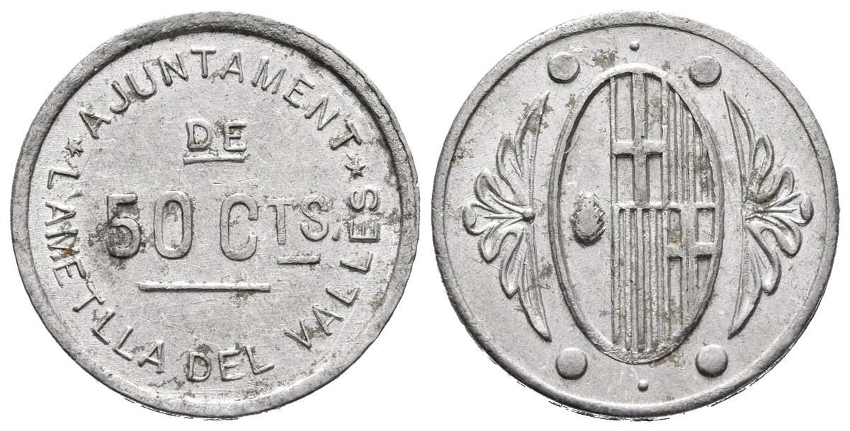 L'AMETLLA DEL VALLES (Barcelona). 50 Céntimos. (Al. 0,94g/20mm). 1936-1939. (Cal-2019-3). Con inscripción. MBC+.