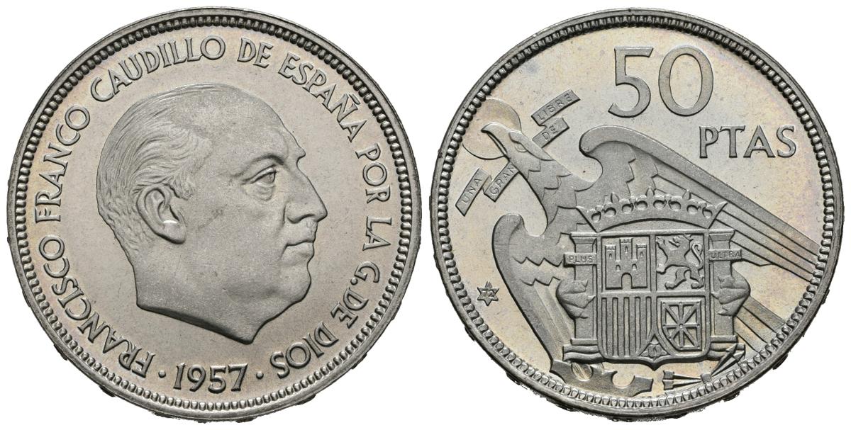 ESTADO ESPAÑOL (1936-1975). 50 Pesetas. (Ni. 12.35g/30mm). 1957 *72. Madrid. (Cal-2019-141). PROOF. Precioso brillo. Escasa
