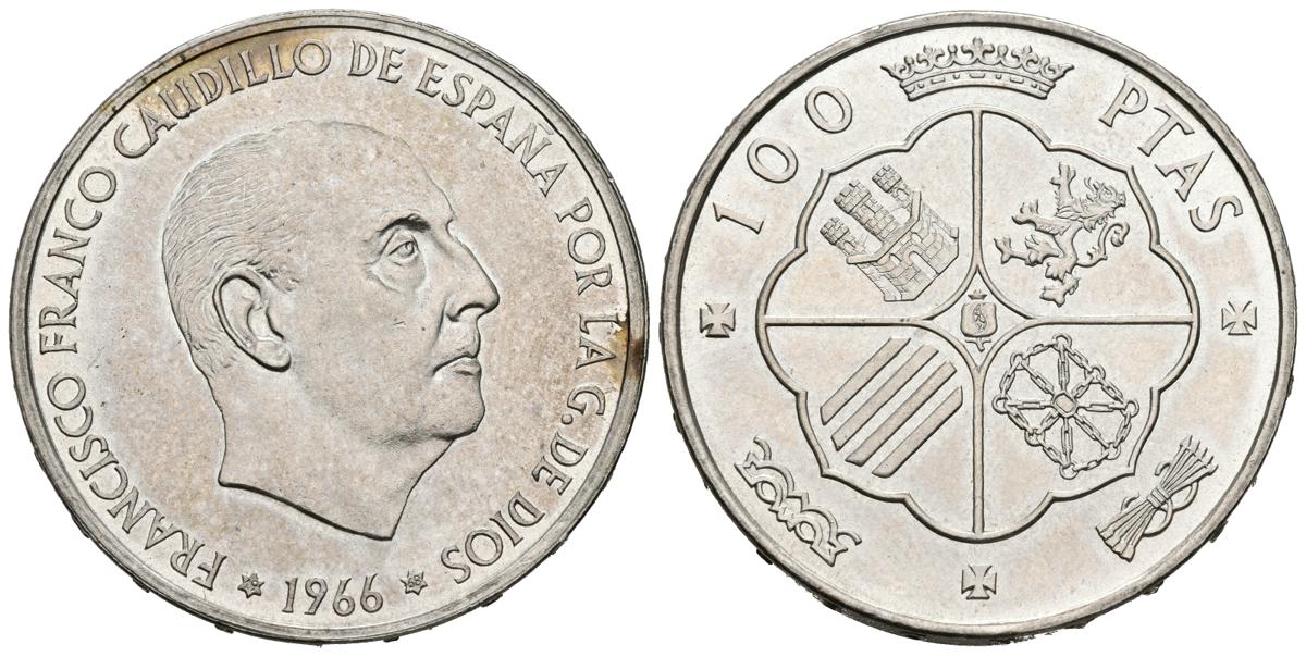 ESTADO ESPAÑOL (1936-1975). 100 Pesetas. (Ar. 19,25g/34mm). 1966 *68. Madrid. (Cal-2019-147). SC. Brillo espejo. Procedente de tira. Magnífico ejemplar.