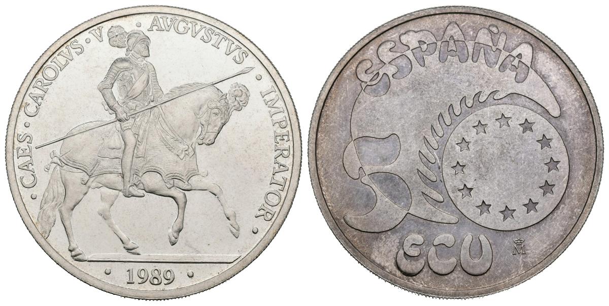 CONTEMPORANEO. 5 Ecu. (Ar. 33,84g/42mm). 1989. FNMT. Carlos V. EBC-. Rayitas de limpieza 250.000 acuñaciones. Incluye estuche oficial y certificado de autenticidad.