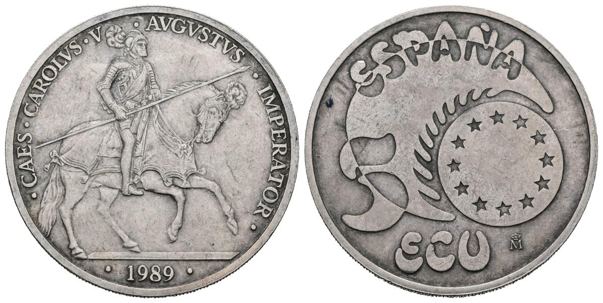 CONTEMPORANEO. 5 Ecu. (Ar. 33,49g/42mm). 1989. FNMT. Carlos V. MBC+. Rayitas de limpieza 250.000 acuñaciones. Incluye estuche oficial.