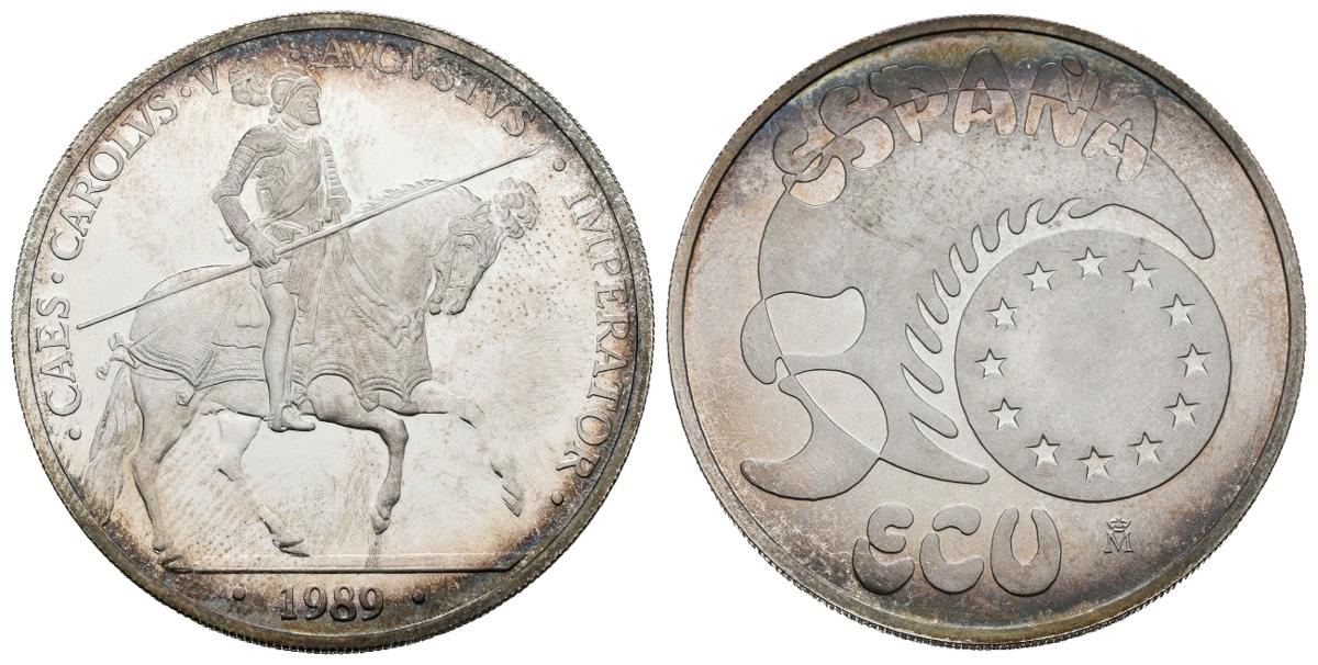 CONTEMPORANEO. 5 Ecu. (Ar. 33,88g/42mm). 1989. FNMT. Carlos V. EBC. 250.000 acuñaciones. Incluye estuche oficial y certificado de autenticidad.