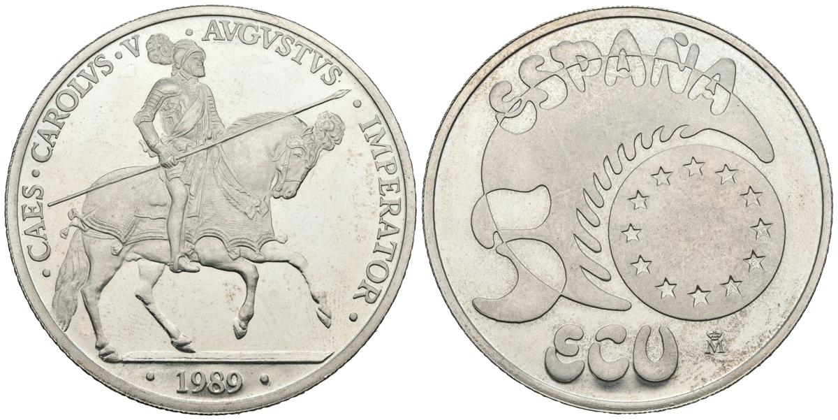 CONTEMPORANEO. 5 Ecu. (Ar. 33,82g/42mm). 1989. Madrid. Carlos V. PROOF.