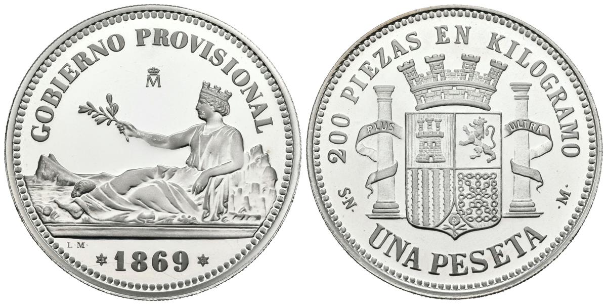 CONTEMPORANEO. 1 Peseta. (Ar. 13,43g/33mm). 1869. Gobierno Provisional. Reproducción actual (años 90) de la FNMT. Perteneciente a la Colección Historia de la Peseta. Madrid. Plata de 0,925 milésimas. PROOF.