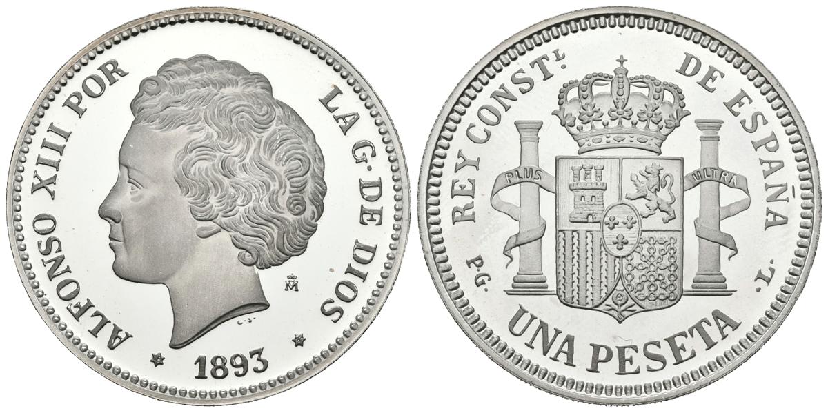 CONTEMPORANEO. 1 Peseta. (Ar. 13,57g/33mm). 1893. Alfonso XIII. Reproducción actual (años 90) de la FNMT. Perteneciente a la Colección Historia de la Peseta. Madrid. Plata de 0,925 milésimas. PROOF.