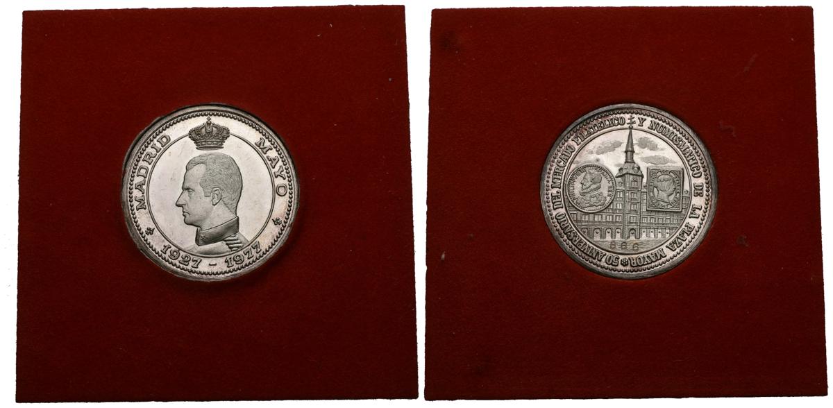 CONTEMPORANEO. 50 Aniversario del Mercado Filatélico y Numismático de la Plaza Mayor de Madrid (1927-1957). (Ar. 25,00g/35mm). Incluye estuche oficial y certificado de garantía. SC.