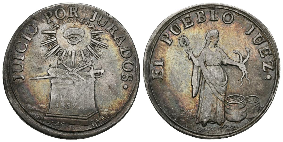 GUATEMALA. El Pueblo Juez. (Ar. 6,66g/26mm). 1837. Lema de la Reforma legal acontecida en el pais tras una revuelta indígena. (Fonrobert-7227). MBC+. Preciosa pátina irisada. Escasa.