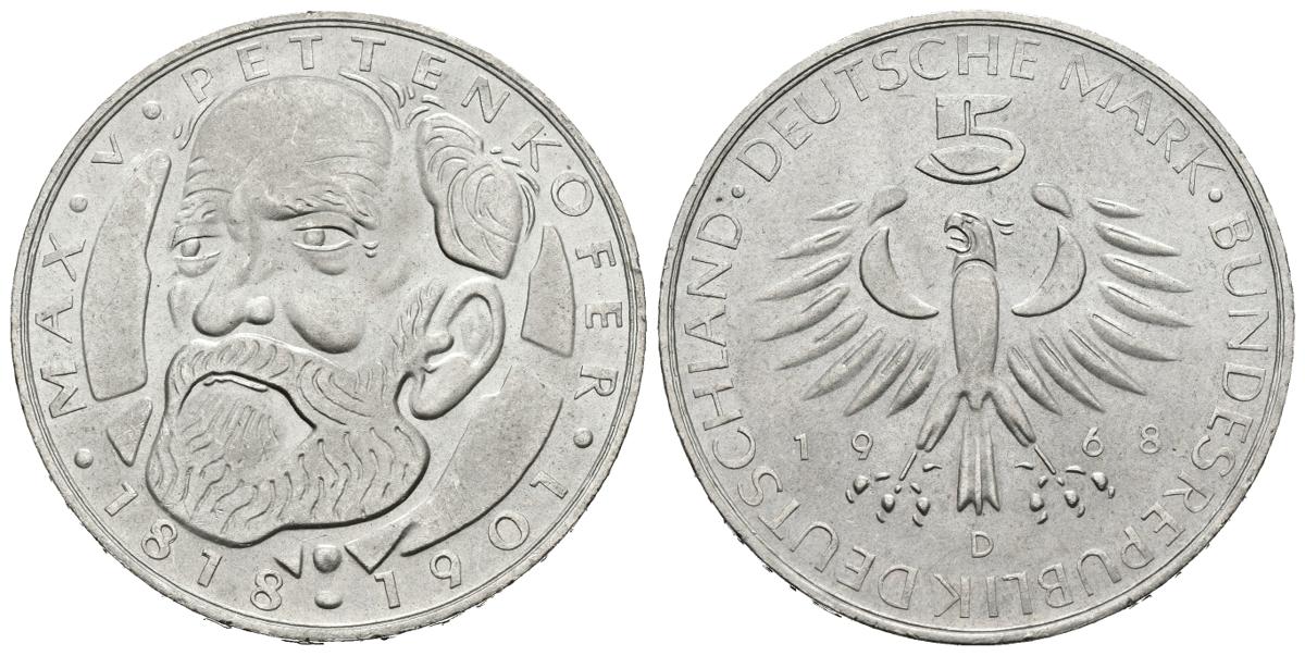 ALEMANIA. 5 Mark. (Ar. 11,20g/29mm). 1968. Munich D. 150 aniversario del nacimiento de Max Von Pettenkofer. (Km#123.1). EBC.