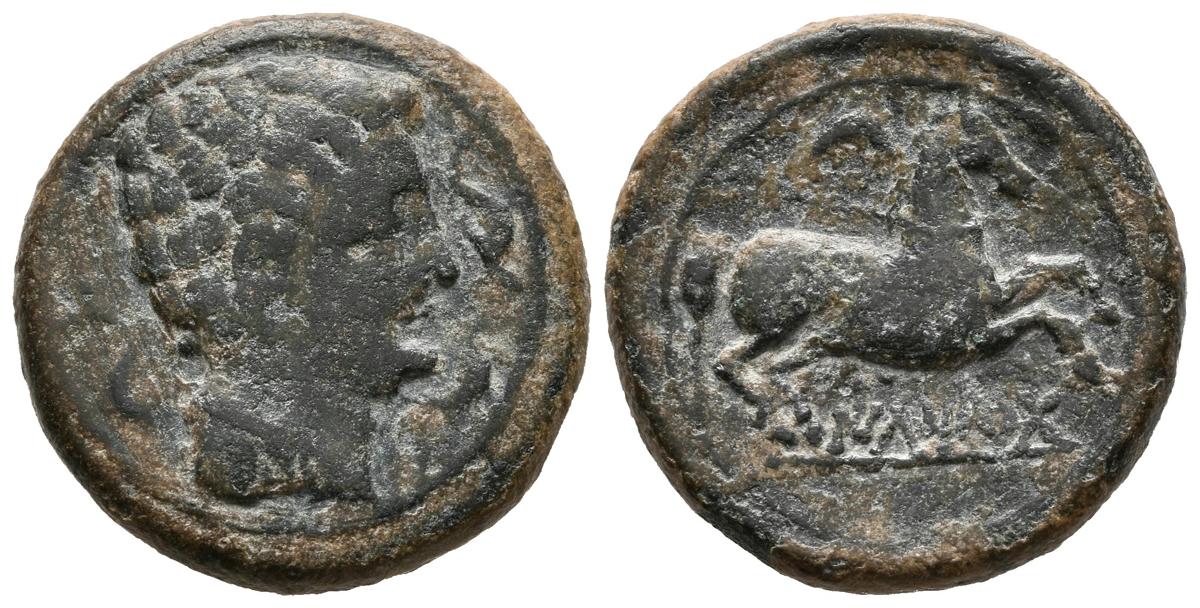 ILTIRTA (Lérida). Semis. (Ae. 7,77g/21mm). 220-200 a.C. (FAB-1467). Anv: Busto masculino a derecha, alrededor tres delfines. Rev: Caballo a derecha, encima creciente, debajo leyenda ibérica sobre línea: ILTiRTa. MBC.
