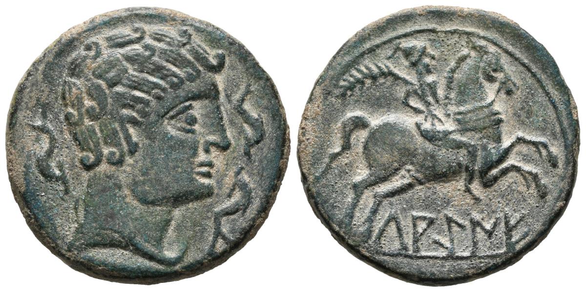 LAGINE (Zona de Aragón). As. (Ae. 9,44g/26mm). 120-20 a.C. Anv: Cabeza masculina rodeada de tres delfines a derecha. Rev: Jinete con palma a derecha, debajo leyenda ibérica: LAGiNE. (FAB-1655). MBC+. Retocado. Escasa así.