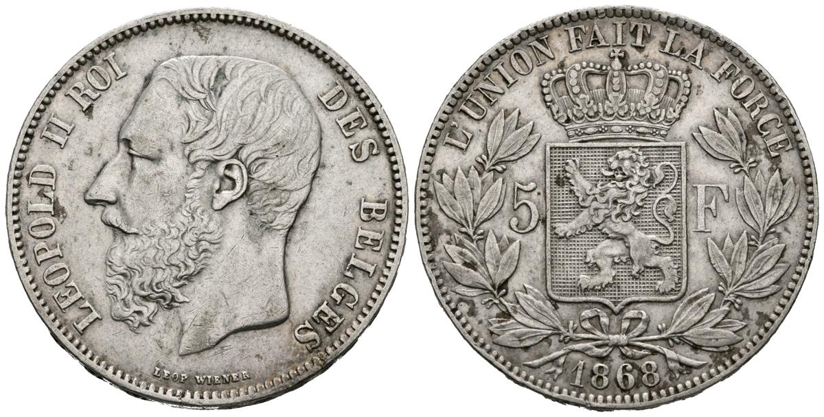 BÉLGICA. 5 Francs. (Ar. 24,92g/37mm). 1868. (Km#24). MBC+.