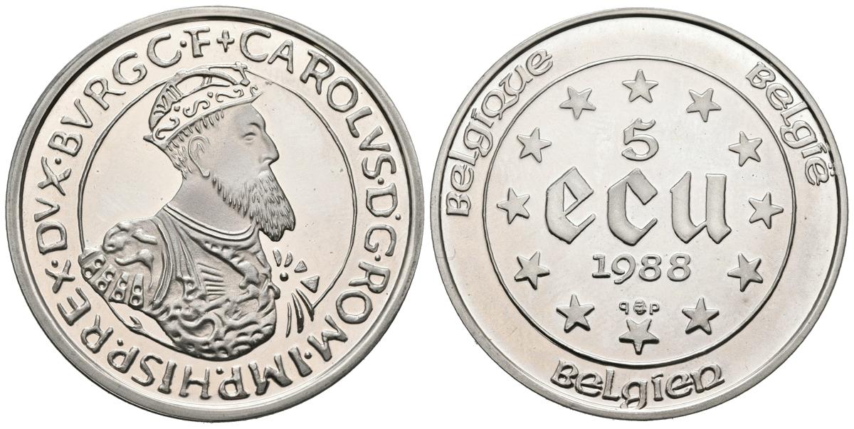 BELGICA . 5 Ecu. (Ar. 22,81g/37mm). 1988. Carlos V. (Km#166.2). SC.