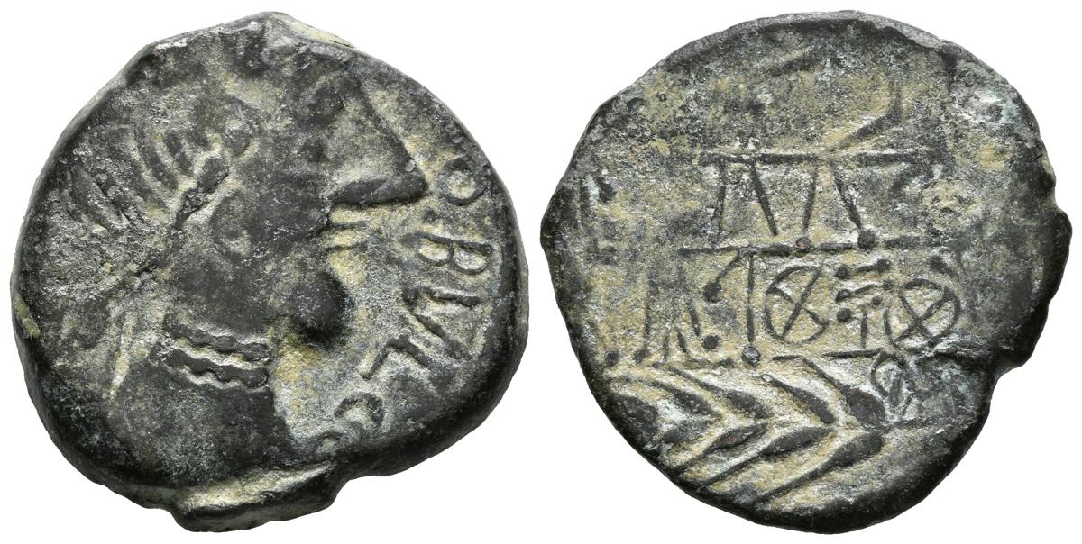 OBULCO (Porcuna, Jaén). As. (Ae. 9,87g/25mm). 220-20 a.C. (FAB-1791). Anv: Cabeza femenina a derecha, delante leyenda: OBVLCO. Rev: Leyenda ibérica: ORCaILV/NTuSTuLDuCo, encima arado a derecha, debajo espiga a izquierda con letra Ta encima. MBC-.