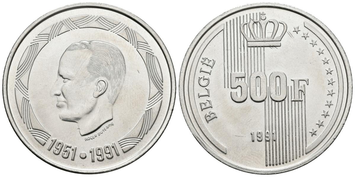 BELGICA. 500 Francs. (Ar. 22,82g/37mm). 1991. 40 Aniversario del Reinado del Rey Balduino. Leyenda en flamenco. (Km#196). SC.
