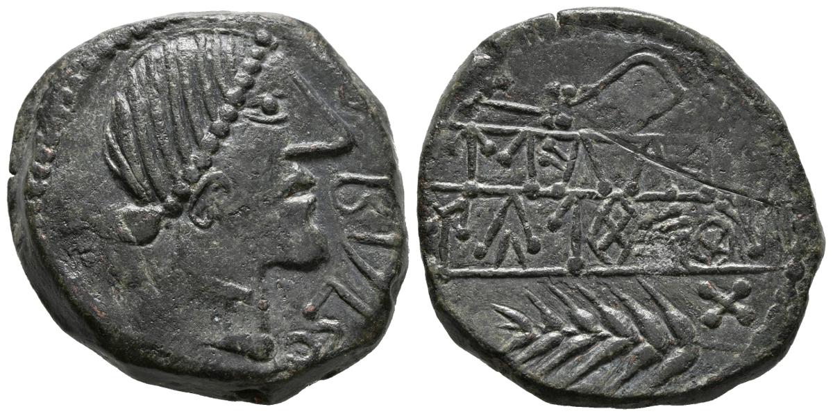 OBULCO (Porcuna, Jaén). As. (Ae. 16,20g/29mm). 220-20 a.C. Anv: Cabeza femenina a derecha, delante leyenda: OBVLCO. Rev: Arado a derecha, debajo espiga a izquierda, sobre esta letra ibérica Ta, entre arado y espiga leyenda ibérica: ORCaILV/ NTuSTuLDuCo. (FAB-1791). MBC+.