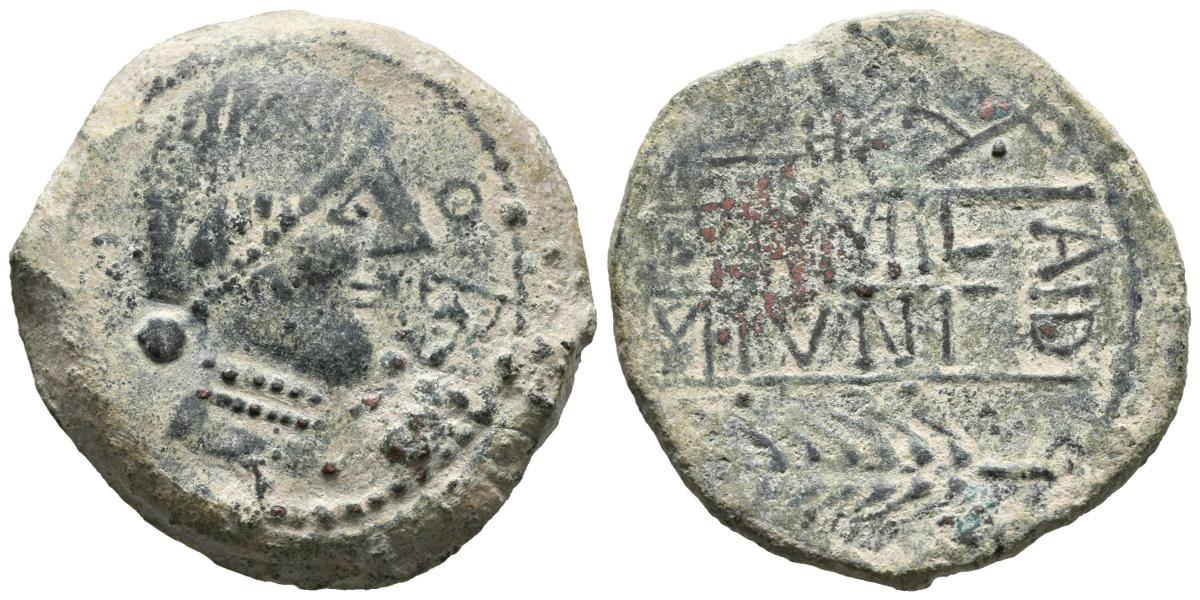 OBULCO (Porcuna, Jaén). As. (Ae. 17,99g/30mm). 220-20 a.C. (FAB-1818). Anv: Cabeza femenina a derecha, delante leyenda: OBVLCO. Rev: Leyenda: L AMIVL/M IVNI, encima arado a derecha, debajo espiga con letra ibérica Ta, a derecha leyenda AID. MBC-.