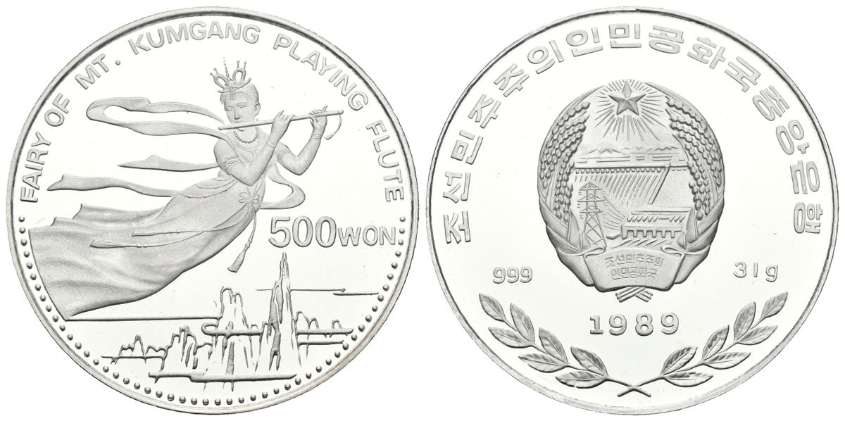 COREA DEL NORTE. 500 Won (Ar. 30,99g/40mm). 1989. Fairy of Mount Kumgang . (Km#32). PROOF. Incluye cápsula y estuche.