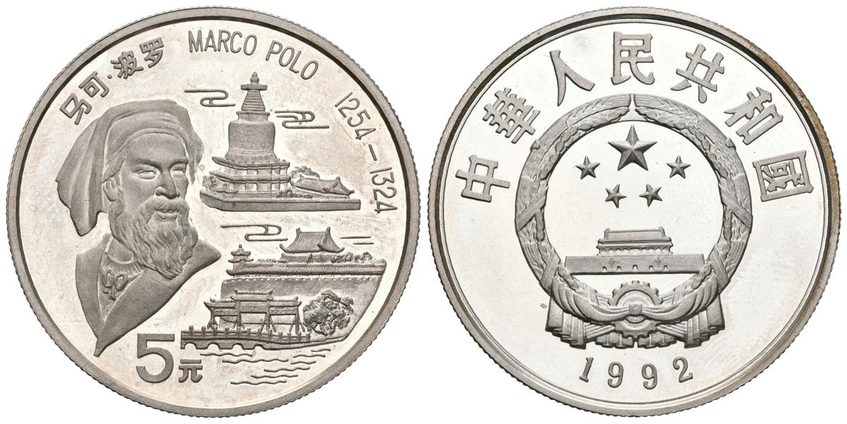 CHINA. 5 Yuan (Ar. 45,23g/33mm). 1992. Marco Polo 1254-1324. (Km#467). Proof. Sólo 12.000 piezas acuñadas.