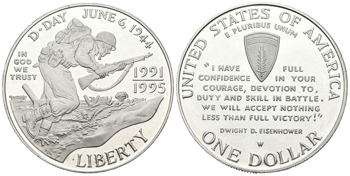ESTADOS UNIDOS. 1 Dollar. (Ar. 27,16g/32mm). 1995. D Day. 6 Junio de 1944; II Guerra Mundia). (Km#244). PROOF.