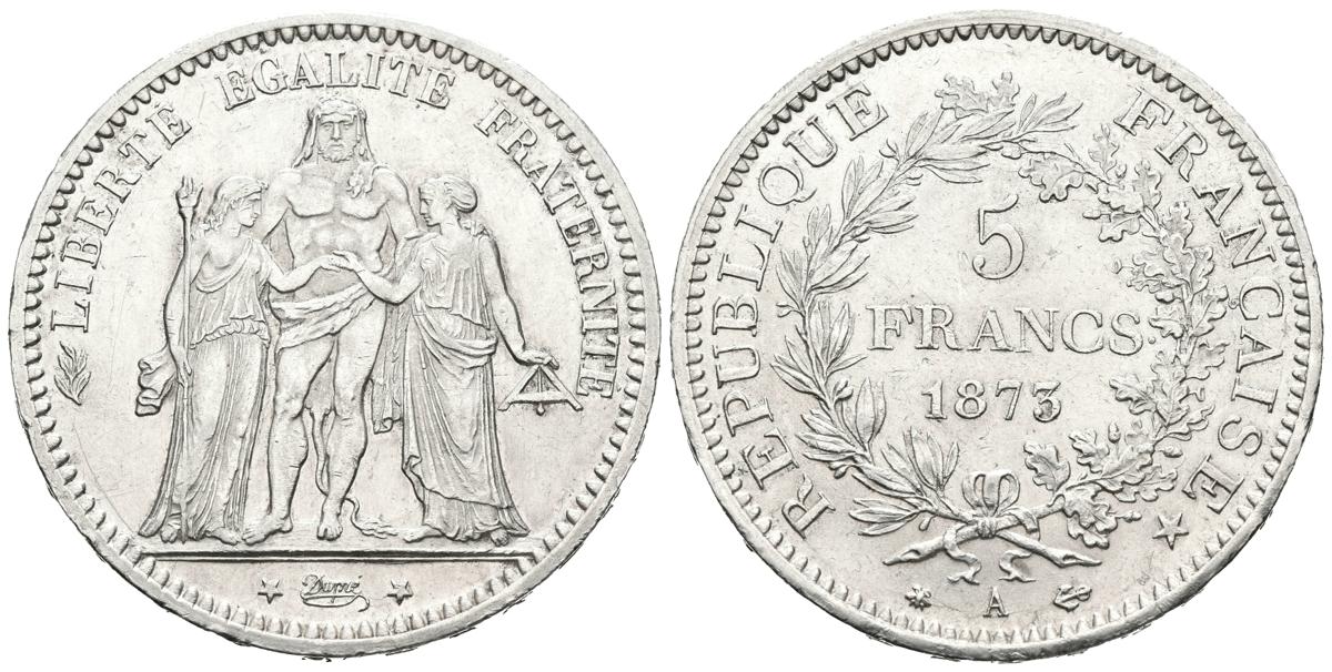 FRANCIA. 5 Francs. (Ar. 24,86g/37mm). 1873. París A. (Km#820.1). MBC+. Limpiada.