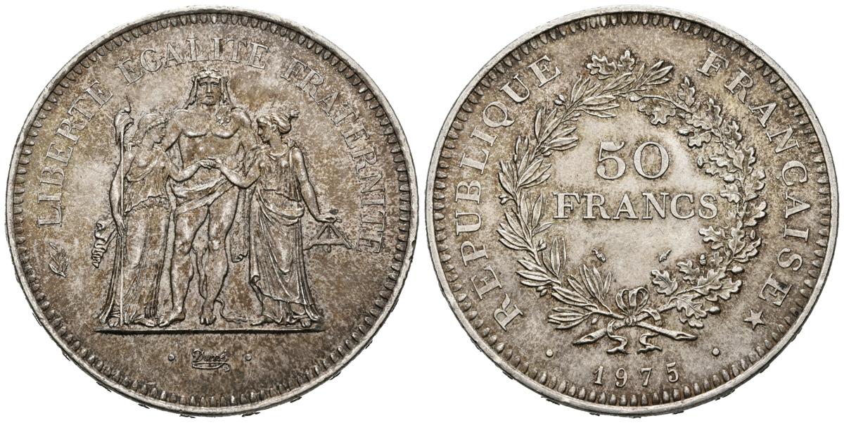 FRANCIA. 50 Francs. (Ar. 30,14g/41mm). 1975. (Km# 941.1). SC. Precioso tono.