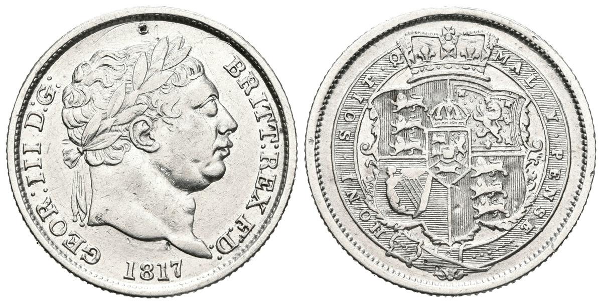 GRAN BRETAÑA. 1 Shilling. (Ar. 5,59g/24mm). 1817. George III. (Km#666). MBC+/EBC-. Pequeña perforación y raya en anverso. Aún así, muy bonito ejemplar.