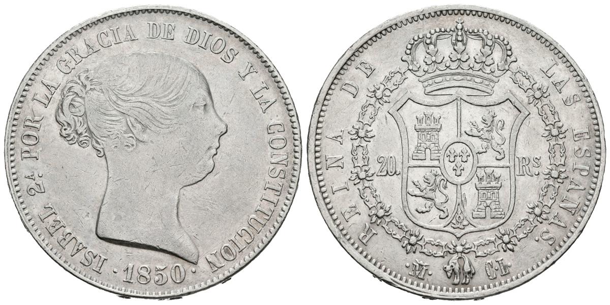ISABEL II (1833-1868). 20 Reales. (Ar. 25,90g/37mm). 1850. Madrid CL. (Cal-2019-591). MBC/MBC+. Escaso.
