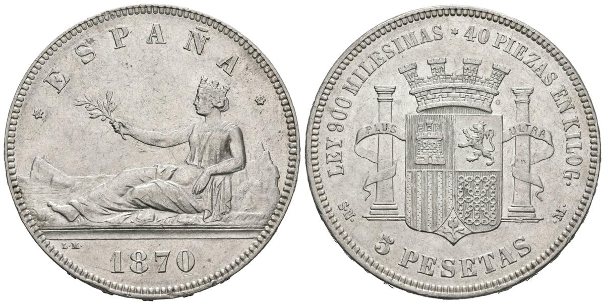 GOBIERNO PROVISIONAL (1868-1874). 5 Pesetas. (Ar. 24,93g/37mm). 1870 *18-70. Madrid SNM. (Cal-2019-39). MBC+.