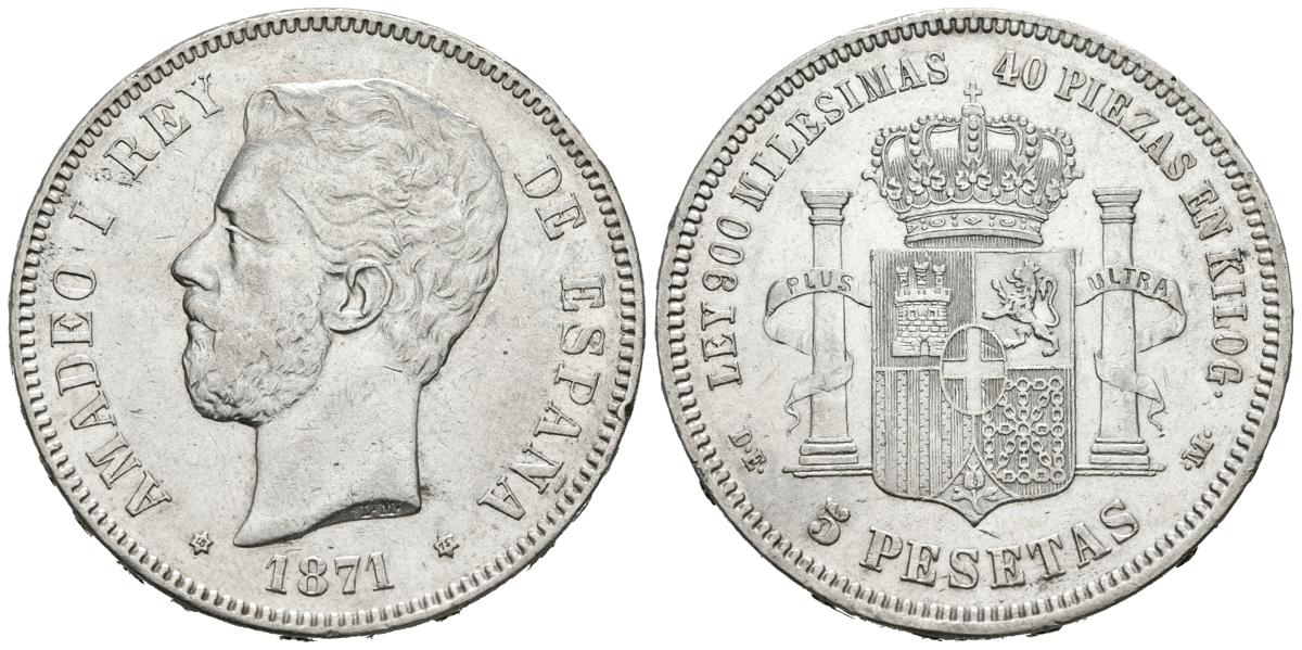 AMADEO I (1871-1873). 5 Pesetas. (Ar. 24,77g/37mm). 1871 *18-75. Madrid DEM. (Cal-2019-7). EBC-.
