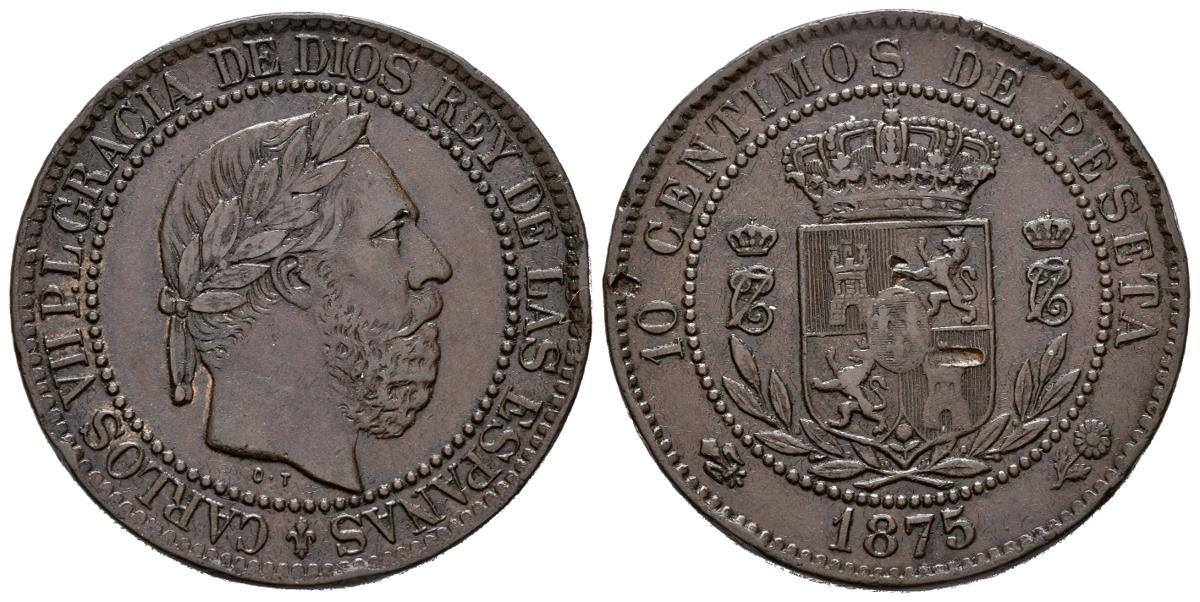 CARLOS VII, el Pretendiente. (1868-1909). 10 Céntimos de Peseta. (Ae. 10,01g/30mm). 1875. Oñate. (Cal-2019-5). MBC+.