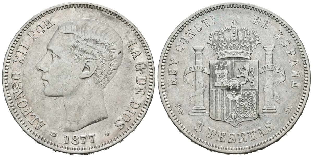 ALFONSO XII (1874-1885). 5 Pesetas. (Ar. 25,00g/37mm). 1877 *18-77. Madrid DEM. (Cal-2019-38). MBC.
