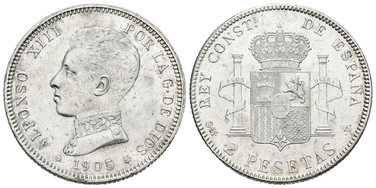 ALFONSO XIII (1885-1931). 2 Pesetas. (Ar. 9,85g/27mm). 1905 *19-05. Madrid SMV. (Cal-2019-88). EBC+. Brillo original.