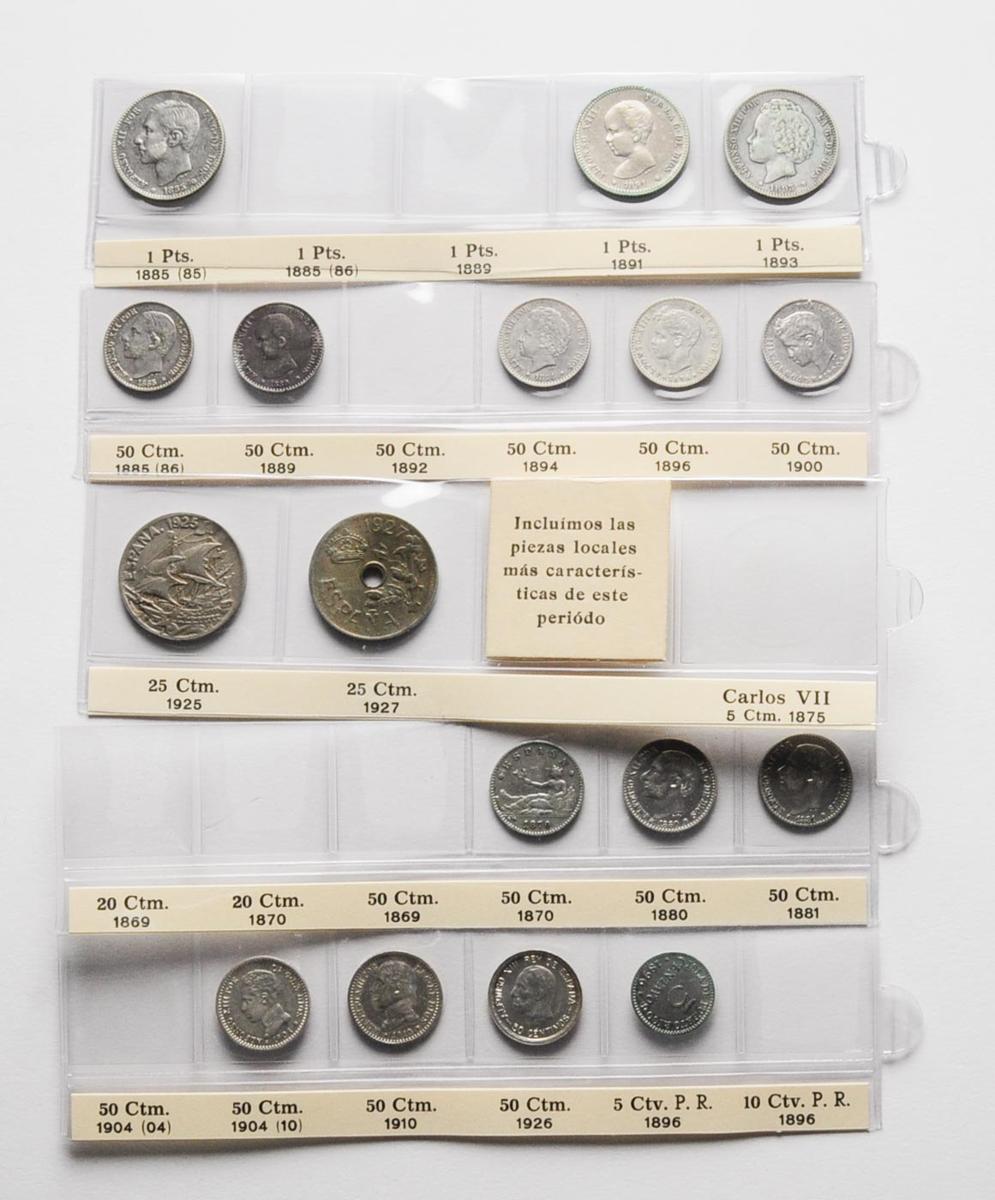 CENTENARIO DE LA PESETA. Bonita colección del Centenario de la Peseta compuesta por 56 piezas (39 en plata, 2 en níquel y 15 en cobre ) sin piezas repetidas y que incluye una gran variedad tanto de módulos como de fechas. En cobres destacan las series de 1, 2 y 5 céntimos. En plata están representados los módulos de 50 Céntimos, 1, 2 y 5 Pesetas (Pelón, bucles y cadete están representados dentro de las acuñaciones de Alfonso XIII), además de los 50 Centavos de Manila. En general, buen estado en general de la colección. A EXAMINAR.