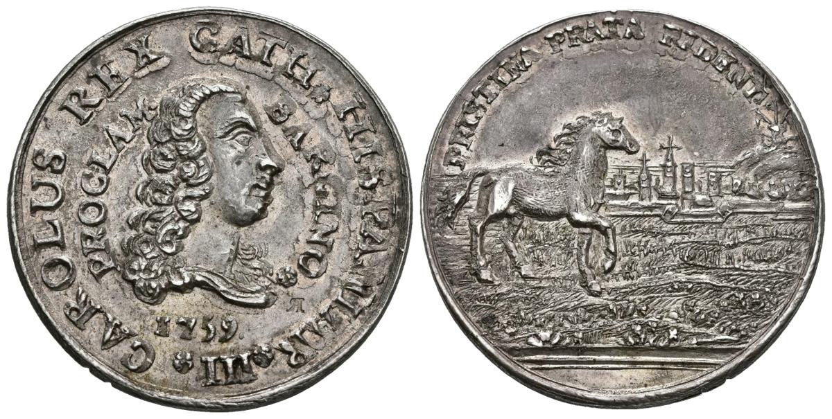 CARLOS III (1759-1788). Proclamación en Barcelona. (Ar. 7,99g/29mm). 1759. Grabador: I. Valls. (Vives 25; RAH 223). Anv: Busto drapeado de Carlos IV, alrededor leyenda: CAROLUS REX CATH HISPANIAR III/PROCLAM BARCINO, debajo del busto: 1759. Rev: Caballo suelto al paso, detrás Barcelona fortificada defendida por Montjuic, encima leyenda: PRISTINA PRATA PIDENT. EBC-. Preciosa pátina.Las ceremonias de proclamación de los monarcas nunca fueron una tradición en la corona de Aragón, todo lo contrario de lo que ocurría en Castilla. De hecho fueron introducidas por la dinastía de los Borbones a raíz de la Guerra de Sucesión. El 24 de septiembre de 1759 se celebró en Barcelona el advenimiento al trono de Carlos III. Y es que conviene no olvidar que el nuevo monarca hizo la entra triunfal en su reino precisamente por el puerto de Barcelona. Una entrada cargada de simbolismo pues, no en vano, hacía casi medio siglo que un rey de España no visitaba la ciudad.