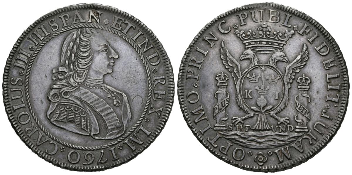 CARLOS III (1759-1788). Proclamación del monarca en Lima. (Ar. 22,92g/37mm). 1760. Acuñación considerada anónima. (Vives 36; RAH 278). Anv: Busto laureado de Carlos III con coraza, banda, manto y collar del toisón, alrededor leyenda: CAROLUS III HISPAN ET IND REY LM 1760. Rev: Escudo oval, sobre el pecho de águila bicéfala coronada, formado por tres coronas bajo estrella y una granada debajo, flanqueadas por las letras K-I, a los lados las columnas de Hércules coronadas y encintadas con las leyendas: PLVS-VLTRA, debajo, sobre ondas: SUP-VND, alrededor leyenda: OPTIMO PRINC PUBL FIDELIT JURAM. EBC. Perforación reparada profesionalmente. Bonita pátina. Escasa.
